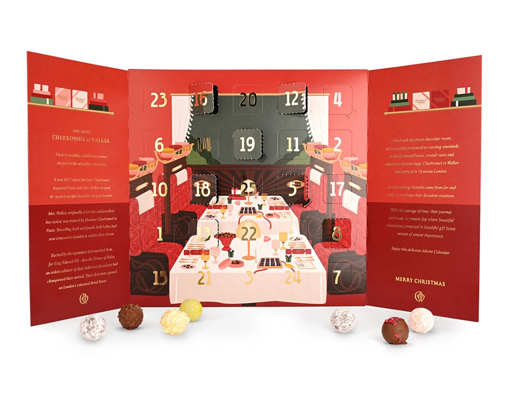 All aboard for the Charbonnel et Walker Christmas countdown, a journey of chocolate making history. To celebrate 150 years, your 1875 carriage awaits with this decadent Dark, Milk and White Chocolate Advent Truffle Selection Calendar.  Open a door each day to reveal Milk Chocolate, Milk Sea Salt Caramel, Raspberry, Strawberry, Chocolate Brownie, Coconut, Caramelised Biscuit and Pistachio Truffles. Take your seats with Madame Charbonnel and Mrs Walker, Paris to London. A delicious destination awaits for Christmas Day.