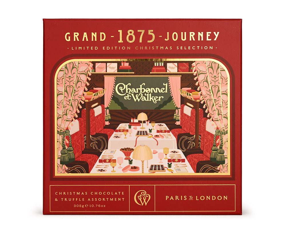 Celebrate a journey of chocolate making history from 1875- 2025. This splendid Milk, Dark and White Chocolate and Truffle Assortment is filled with a sumptuous selection. Enjoy Orange & Cinnamon, Praline Yule Logs, Spiced Raspberry Truffles, Stem Ginger enrobed in Dark Chocolate, Coconut Truffles and more. Take your seats in the Chocolate Carriage  with Madame Charbonnel and Mrs. Walker, Paris to London to open their first store on Bond Street in 1875. The Grand 1875 Christmas Chocolate & Truffle Assortment – 305g, a delicious destination this Christmas.