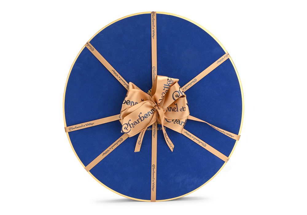 This very elegant gift box was first introduced in 1909. Understated elegance abounds with this plush blue velvet Boite Marine, filled with a signature selection of our delicious Fine Milk and Dark Chocolates. Chocolates in this gift box do not contain alcohol.