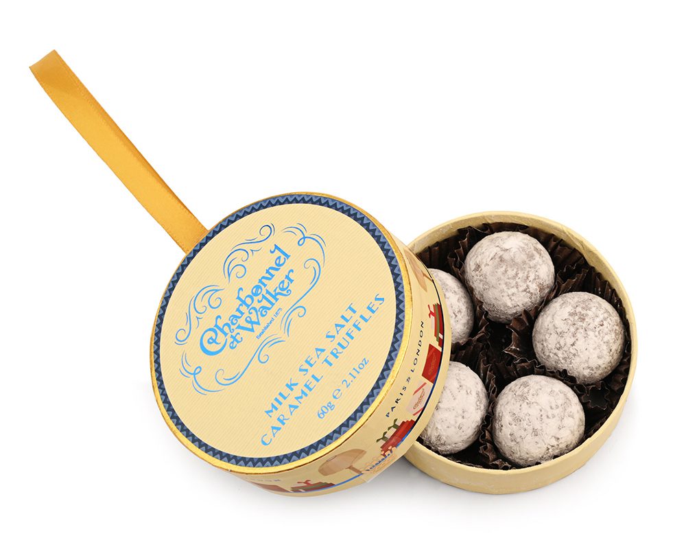 This delightful bauble is filled with four Milk Sea Salt Caramel Truffles. A sweet caramel centre with a hint of sea salt, all captured in a velvety milk chocolate shell. Housed in a beautiful bauble gift box in cream, gold and blue, the sides illustrated with train carriage decorations. A journey from Paris to London as we celebrate 150 years of chocolate making history. Perfect for the Christmas tree, Christmas table and all important stocking fillers.