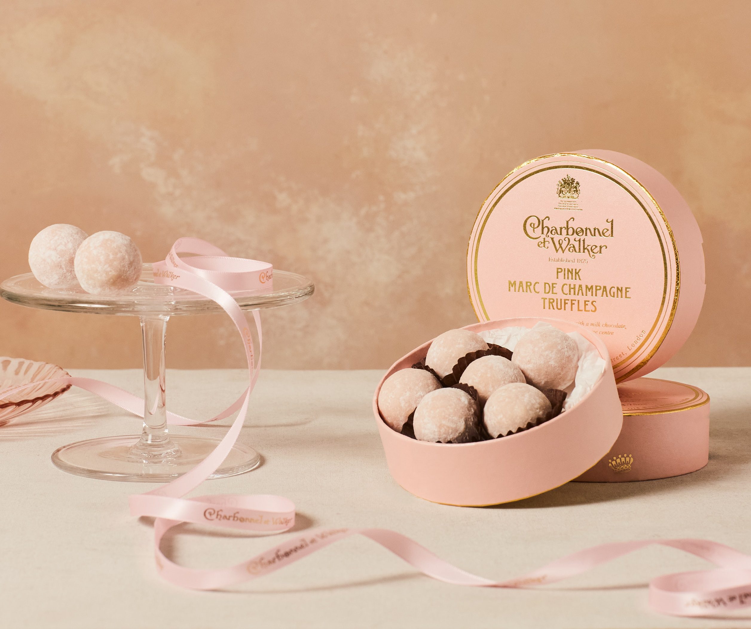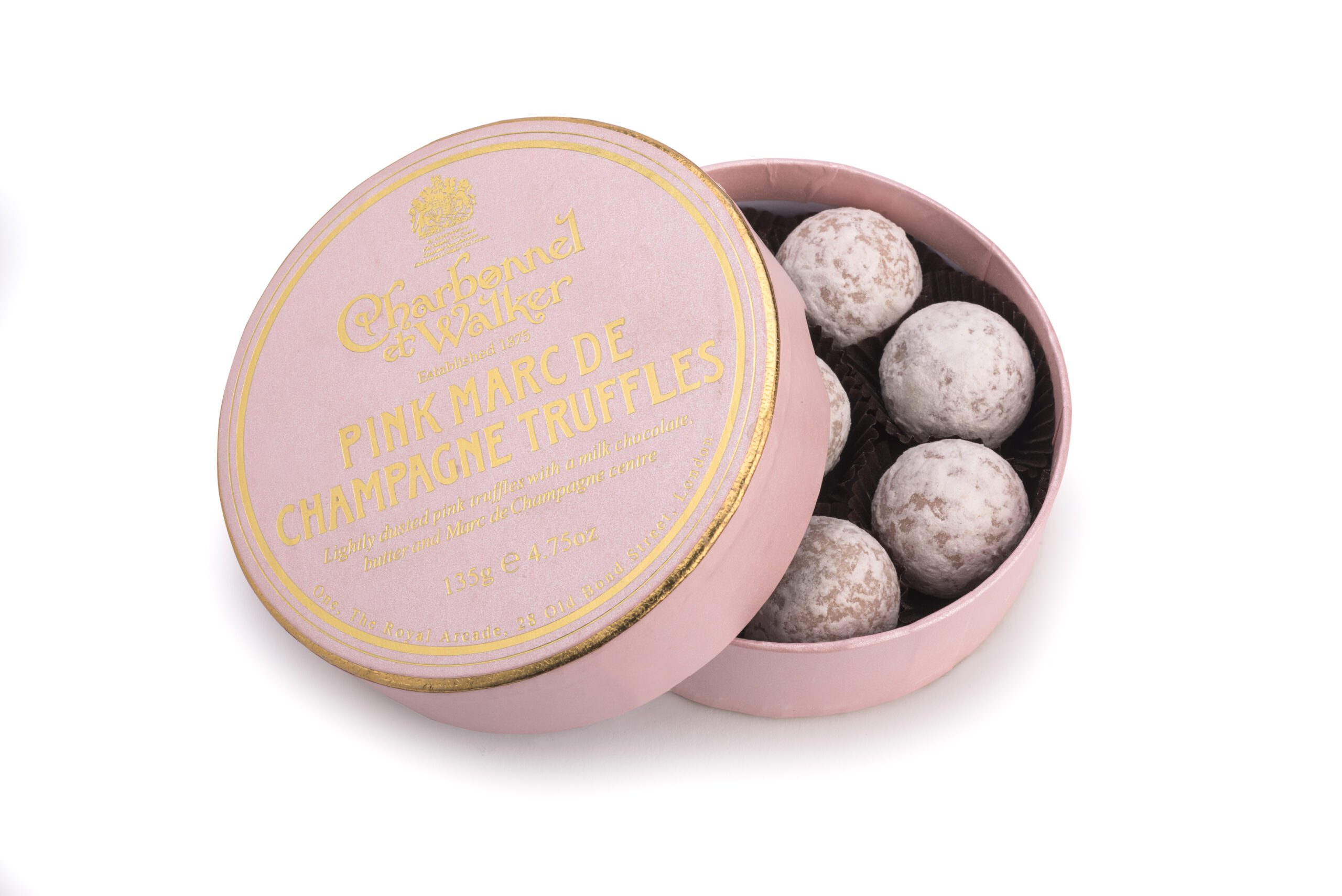 A beautiful gift box filled with iconic Pink Marc de Champagne chocolate Truffles. A luxurious white chocolate truffle with a hint of strawberry and a creamy milk chocolate Marc de Champagne centre, all rolled in a little powdered sugar for an extra touch of elegance. Suitable for Vegetarians.