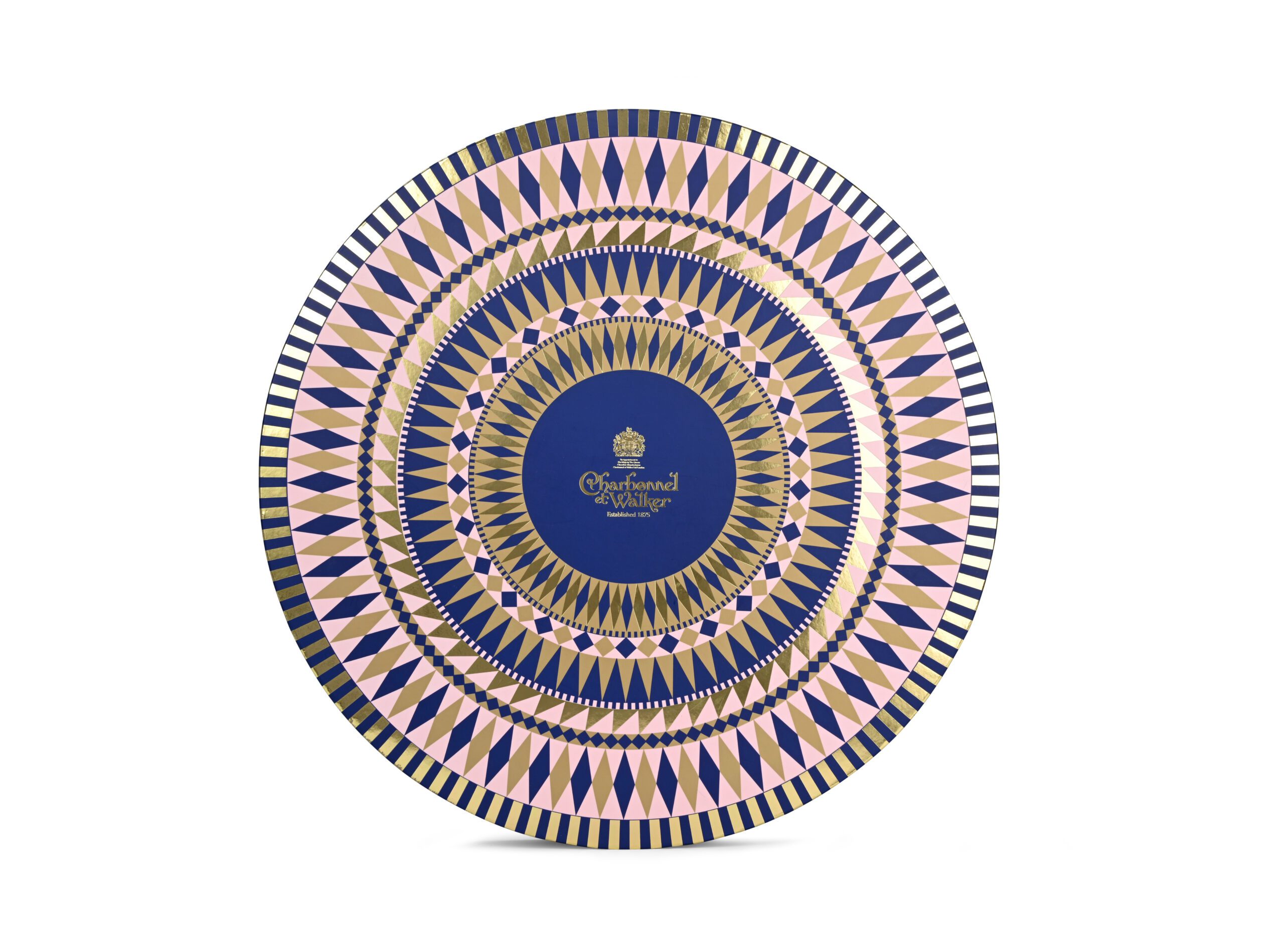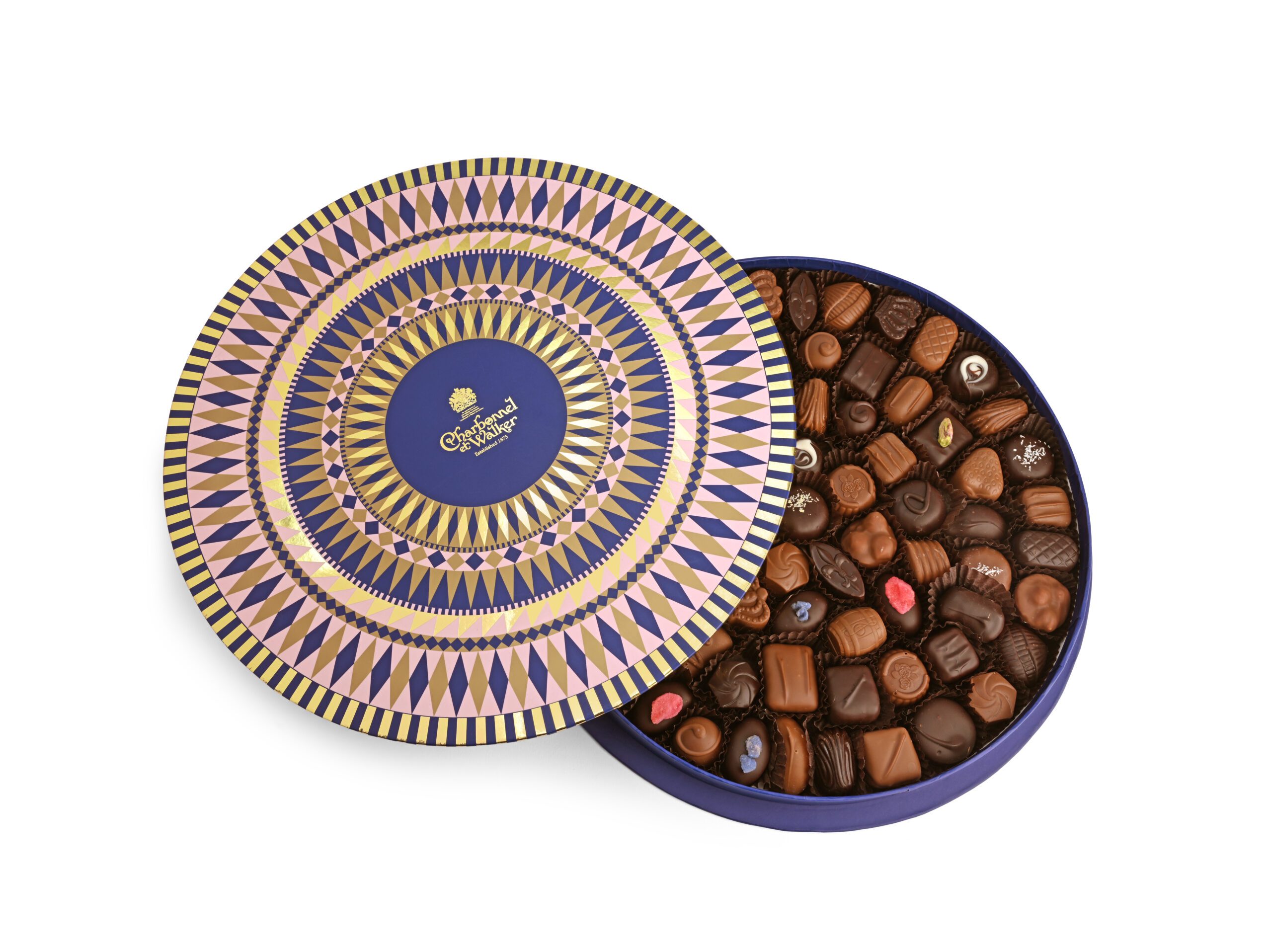 A magnificent gift box with Victorian inspired geometric design and cascading colours of pink, navy and gold. Filled to perfection, the lid opens to an impressive array of our most iconic and classic Fine Milk and Dark Chocolates. With Rose and Violet Creams, Caramel Noix, Romano, Falstaff, Butter Fourre, Milk and Dark Chocolate Crowns, Orange Cream, Vanille Creme, Fraise, Truffle Cafe and many, many more.